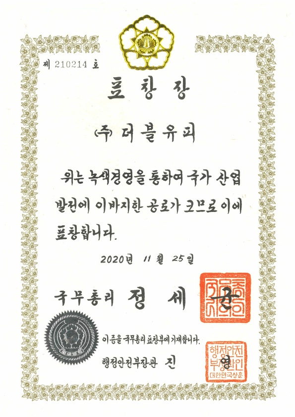 ÁÖ½Äȸ»ç ´õºíÀ¯Çǰ¡ 2020 Áö¼Ó°¡´ÉÇÑ »ý»ê¼º Çâ»ó ¹× ½Å¼ºÀå ¡¤ ³ì»ö°æ¿µ À¯°øÀ¸·Î ±¹¹«ÃѸ® ǥâÀ» ¼ö»óÇÏ¿´½À´Ï´Ù.